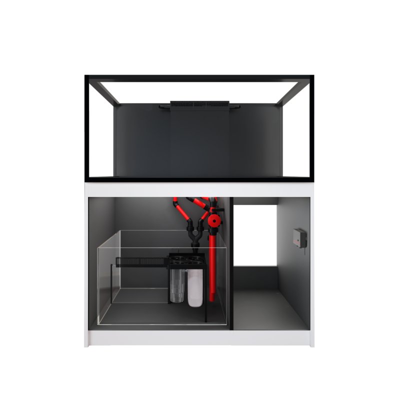 Komora filtracyjna z skarpetami pozwala i zapobiega zatykaniu się pompy. Komora jest łatwa w edycji i standardową skarpetę filtracyjną można zastąpić Red Sea ReefMat, który jeszcze dokładniej zadba o klarowność Twojej wody w zbiorniku. Woda po filtracji wstępnej jest transportowana do komory odpieniacza gdzie jest utrzymywany stały poziom wody tak aby praca odpieniacza była zawsze wykorzystana w stu procentach. Komora bubble stop pozwala na wyłapanie pojedynczych pęcherzyków powietrza. Tak przefiltrowana woda trafia do komory z pompą obiegową (nie załączona w zestawie) która ponownie wypompuje wodę do zbiornika głównego.
