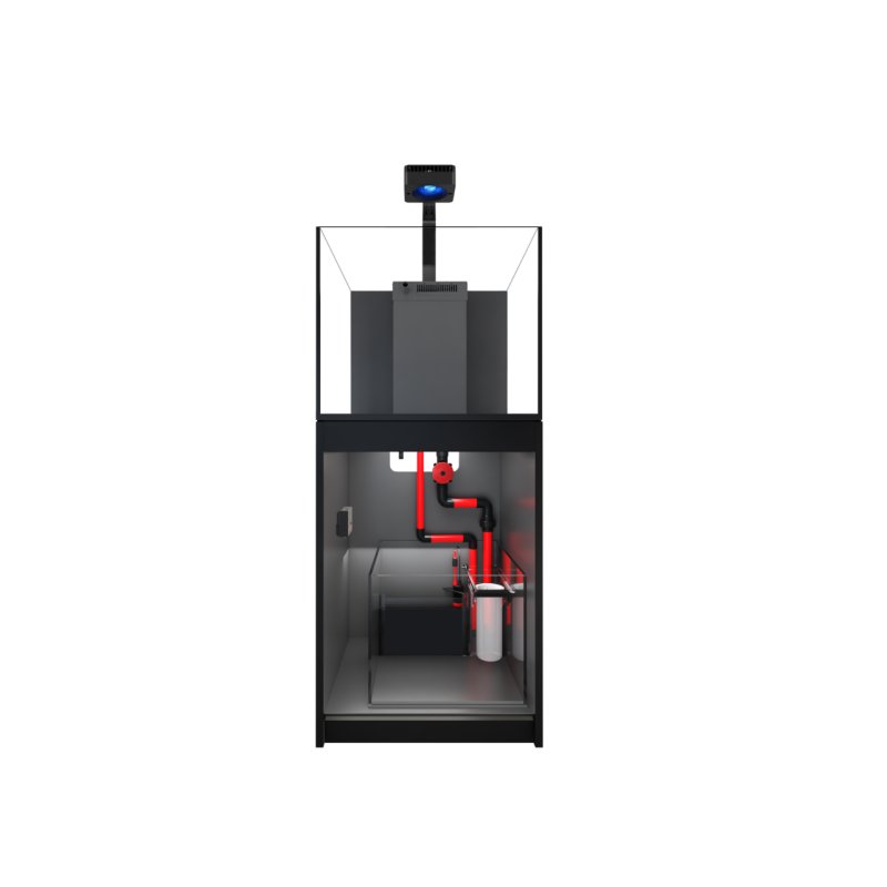 Komora filtracyjna z skarpetami pozwala i zapobiega zatykaniu się pompy. Komora jest łatwa w edycji i standardową skarpetę filtracyjną można zastąpić Red Sea ReefMat, który jeszcze dokładniej zadba o klarowność Twojej wody w zbiorniku. Woda po filtracji wstępnej jest transportowana do komory odpieniacza gdzie jest utrzymywany stały poziom wody tak aby praca odpieniacza była zawsze wykorzystana w stu procentach. Komora bubble stop pozwala na wyłapanie pojedynczych pęcherzyków powietrza. Tak przefiltrowana woda trafia do komory z pompą obiegową (nie załączona w zestawie) która ponownie wypompuje wodę do zbiornika głównego.