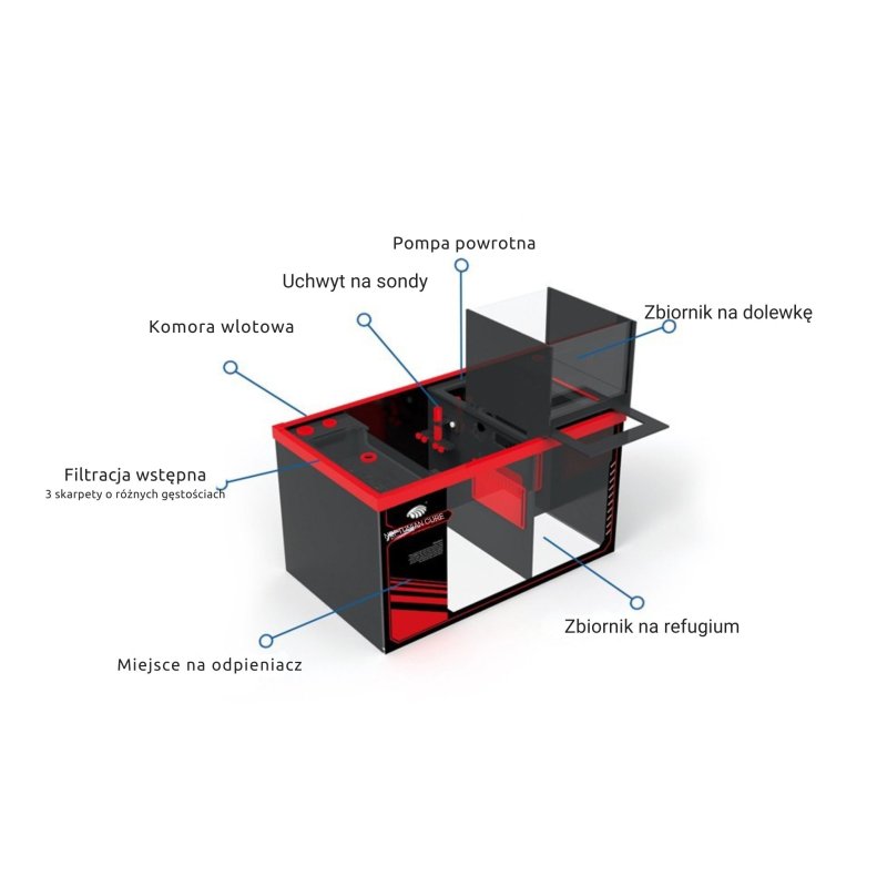 Sump wyposażony jest w przegrody umożliwiające logiczny podział stref filtracyjnych. Znajduje się w nim miejsce na odpieniacz, grzałkę, media chemiczne lub biologiczne oraz pompę powrotną. Wszystkie elementy hydrauliczne są dostarczane w zestawie, co znacząco skraca czas montażu.