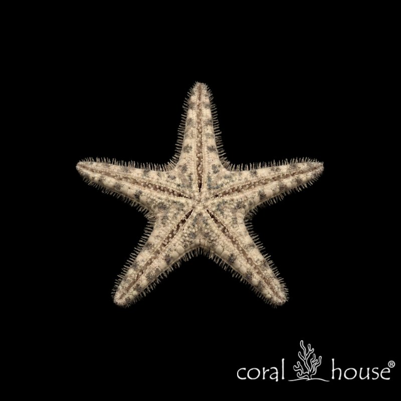 Archaster typicus to jedna z najpopularniejszych i najbardziej cenionych rozgwiazd w akwarystyce morskiej. W odróżnieniu od swoich kolorowych kuzynów, jej wygląd jest stonowany i nastawiony na kamuflaż: ciało ma barwę szaro-beżową z ciemniejszymi, geometrycznymi wzorami, co pozwala jej idealnie wtopić się w tło piaszczystego dna. Dorasta zazwyczaj do około 10-15 cm średnicy. Choć nie jest jaskrawa, akwaryści cenią ją za niezwykłą pracowitość i specyficzny tryb życia – większość czasu spędza bowiem zakopana tuż pod powierzchnią piasku.