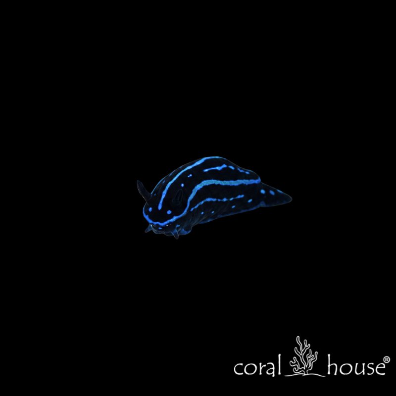 Chelidonura varians, często nazywana Ślimakiem Aksamitnym, to jedno z najbardziej eleganckich stworzeń, jakie można spotkać w akwarium morskim. Jej wygląd jest hipnotyzujący: ciało ma głęboką, smolistą czerń o aksamitnej teksturze, która jest konturowana jaskrawymi, neonowo-niebieskimi liniami. Kształtem przypomina nieco "latający dywan" z charakterystycznym, dwudzielnym ogonem. Jest to niewielki ślimak, dorastający zazwyczaj do 3-5 cm. Mimo małych rozmiarów, jest doskonale widoczny na tle piasku i skał dzięki swojemu kontrastowemu ubarwieniu.