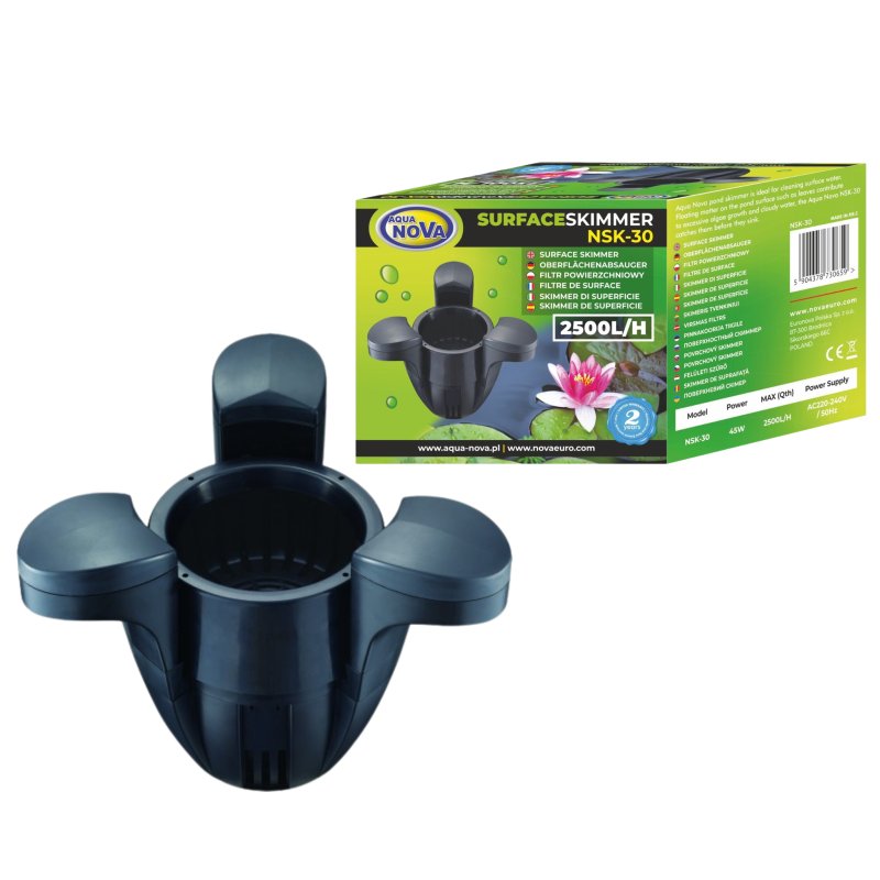 Aqua Nova NSK-30 to wysokiej klasy filtr powierzchniowy, który stanowi pierwszą linię obrony przed zanieczyszczeniami w Twoim oczku wodnym. Urządzenie skutecznie zasysa liście, igliwie, pyłki roślin oraz resztki pokarmu, zanim opadną one na dno i zaczną gnić, pogarszając parametry wody. Dzięki temu skimmerowi lustro wody pozostaje idealnie czyste, co nie tylko podnosi estetykę zbiornika, ale również ułatwia wymianę gazową, zapewniając rybom lepsze natlenienie wody.