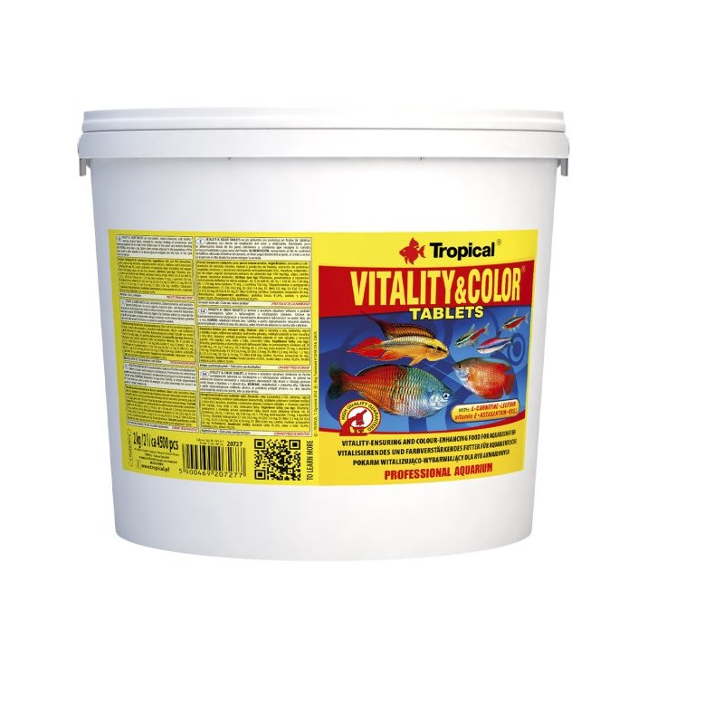 Tablets Vitality & Color to premium wysokobiałkowy pokarm wybarwiający dla ryb. Astaksantyna i L-karnityna wspierają intensywne kolory, wzrost, witalność oraz tarło.