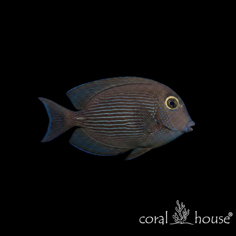 Ctenochaetus strigosus, powszechnie znany w handlu jako "Kole Tang" lub "Yellow-eyed Kole Tang", to ryba, której uroda jest dyskretna, ale hipnotyzująca. Z daleka może wydawać się po prostu ciemna, ale z bliska ukazuje swoje prawdziwe oblicze: jej ciało ma głęboki, bordowo-brązowy kolor, pokryty gęstą siecią jasnych, poziomych prążków. Najbardziej charakterystycznym elementem jest jednak jaskrawożółta obwódka wokół dużego oka, która nadaje rybie wyrazistego wyglądu. Jest to pokolec średniej wielkości, dorastający zazwyczaj do 15-18 centymetrów, co czyni go doskonałym wyborem do zbiorników, które są zbyt małe dla dużych gatunków z rodzaju *Acanthurus*.