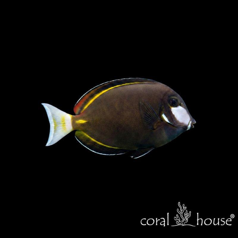 Acanthurus japonicus, potocznie nazywany pokolcem japońskim lub Powder Brown Tang, to ryba, która zachwyca swoją elegancją i wyrafinowaną paletą barw. Jego ciało ma kolor głębokiego, matowego brązu, który stanowi idealne tło dla jaskrawych akcentów: dużej, białej plamy pod okiem, jaskrawo pomarańczowego paska na płetwie grzbietowej oraz żółtych obrzeży płetw. Jest to gatunek średniej wielkości, dorastający zazwyczaj do około 20 centymetrów długości. Dzięki swojemu unikalnemu ubarwieniu i aktywnemu sposobowi bycia, jest jedną z najbardziej poszukiwanych ryb do domowych akwariów morskich, stanowiąc doskonałą alternatywę dla droższego i trudniejszego w utrzymaniu Acanthurus achilles.